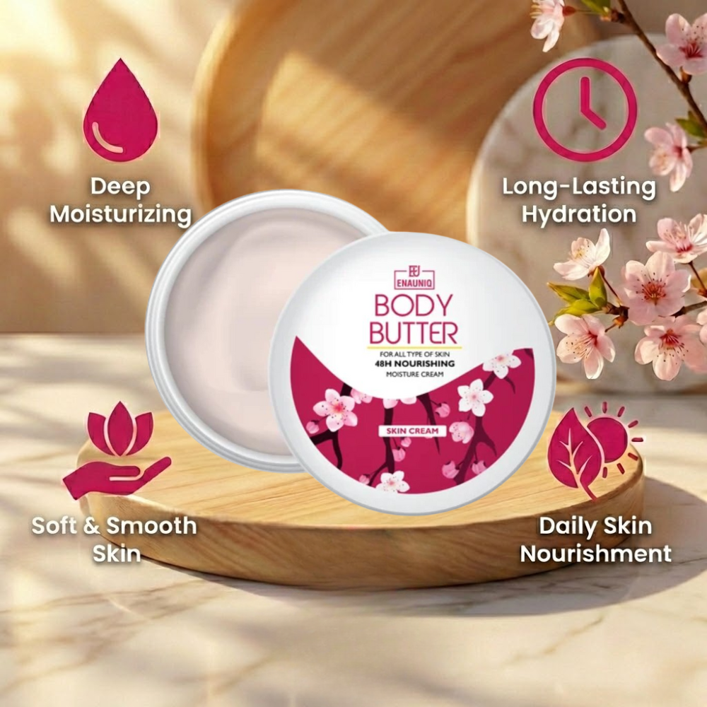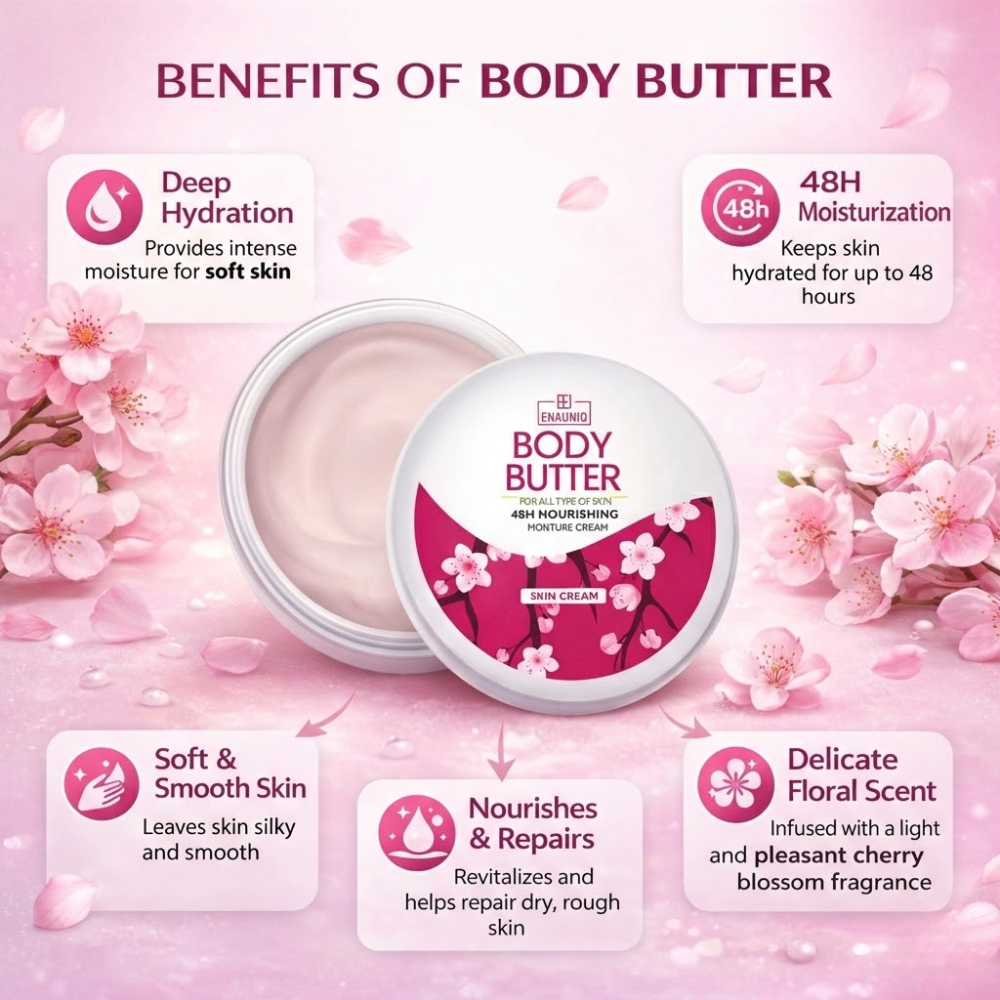 Body butter is a rich blend of natural butters and nourishing oils such as cocoa butter and shea butter, making it thicker and more concentrated than regular body creams. This deeply moisturizing formulation provides intense nourishment, making it especially suitable for dry, cracked, or sensitive skin that requires extra emollient care and long-lasting hydration.