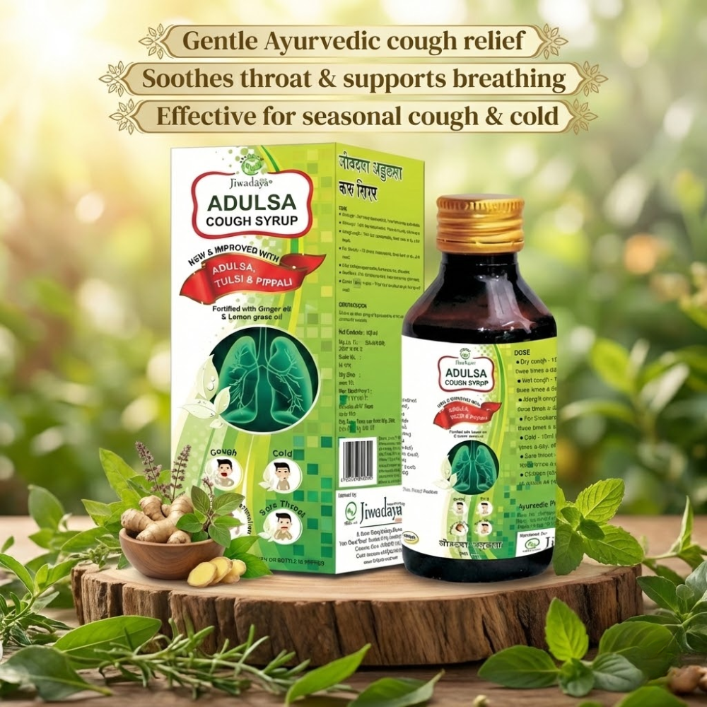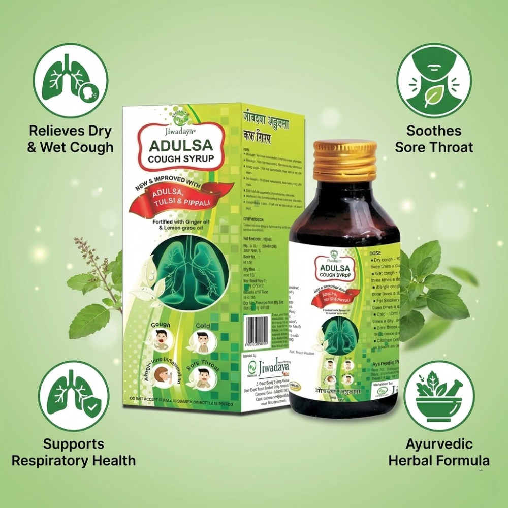 Adulsa Cough Syrup is a unique Ayurvedic formulation enriched with Ginger oil and Lemongrass oil that gently coats and soothes the lining of the upper respiratory tract, helping to suppress the cough reflex naturally. It is an effective Ayurvedic remedy for all types of cough, including dry and wet cough. This 100 ml bottle contains the goodness of potent medicinal herbs that help heal throat soreness and pain while providing a cooling and soothing effect. As a natural cough syrup, it works as a gentle therapy to provide relief from various cough conditions such as dry cough, wet cough, and whooping cough. Formulated with clinically tested medicinal plants, Adulsa Cough Syrup offers anti-inflammatory and antibacterial benefits and is safe for regular use with no known adverse effects.