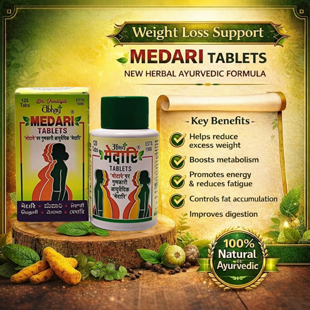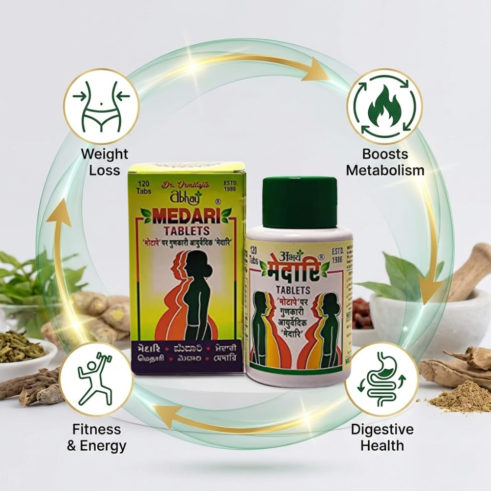 Abhay Medari Slim-Fit Tablet is a natural Ayurvedic formulation made with carefully selected herbs to support healthy weight management. It helps boost metabolism and energy levels, supporting improved stamina and daily activity. The formulation also aids digestion and helps reduce common gastric issues, promoting overall digestive comfort and wellness.