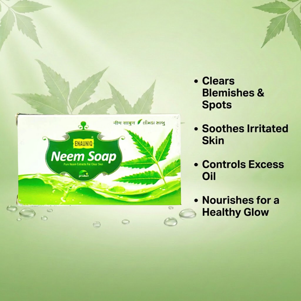 Enauniq Neem Soap is made from natural neem oil. Neem oil helps relieve dry skin while soothing itchiness, redness, and skin irritation, leaving the skin feeling calm and refreshed.